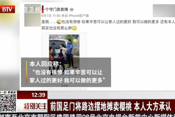 近日,一张前国足门将安琦在大街上摆地摊卖樱桃的照片在网上火速流传,网友们一边质疑着照片的真实性,一边感叹着中国球员退役后 “落寞”的生活。对此,安琦在微博上正式回应了这一事件,他大大方方承认照片中那个有人认不出来的男子就是他本人。他在博文中说: “如果辛苦可以让家人过得更好,我可以做得更多。”