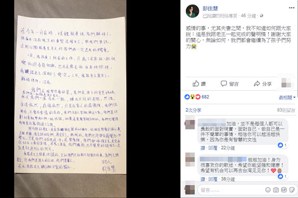对此,彭佳慧6日公开一封亲笔信,与王丕仁共同发出声明,宣告结束12年婚姻,已在2018年3月签字离婚,会发出声明,也是为了顾及孩子,“感情的事,尤其夫妻之间,我不知道如何跟大家说;这是我跟老王一起完成的声明稿!谢谢大家的关心,无论如何,我们都会继续为了孩子们努力。”