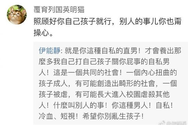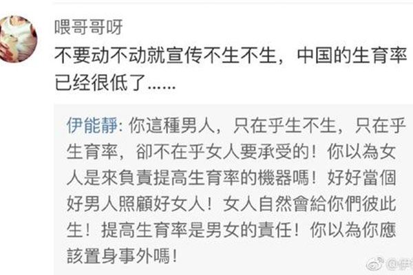 6月11日凌晨,伊能静在自己微博发长文怒怼“直男癌”。她写道:“女人生孩子不是来给你提高国家生育力的,提高生育率,是男女两方的责任,你能在各方面好好爱她爱孩子,她就有勇气继续生,要提高生育率,麻烦提高你做男人的品质!”并表示:“最后这个直男癌!女人不是来给你家生孩子的道具!女人是爱上你了才来跟你有爱的结晶。”“女性不是工具!生儿育女是双方的责任!要想国家未来好,你当个有责任、有爱心能教养出善良有品格的孩子的父亲,如果都是好孩子好家庭,国家一定会好!”