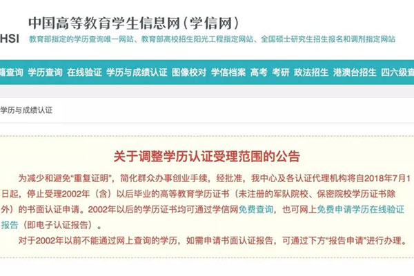 学信网发布《关于调整学历认证受理范围的公告》(来源:学信网截图)