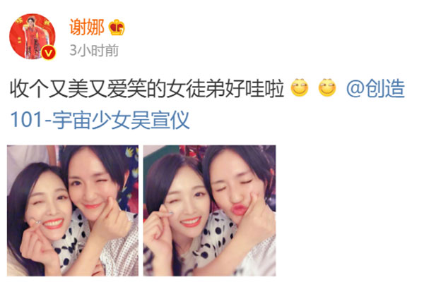 谢娜收吴宣仪为徒:6月25日,谢娜在微博晒出一组与吴宣仪的合照,还配文称:“收个又美又爱笑的女徒弟好哇啦”。照片中,二人对着镜头比心甜笑,十分可爱。同款wink撒娇有点甜,娜姐真的很爱收徒啊!