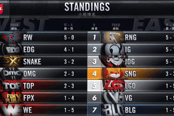 如图是在昨天RNG击败IG之后的积分榜情况(今天进行的比赛中,FPX已经击败了OMG,Snake与TOP的比赛正在进行之中),可以看到,东部的积分榜出现了非常整齐的对称形势,RNG、IG和JDG三支战队的积分和战绩完全相同(由于净胜分关系,RNG排名第一,IG排名第二)。