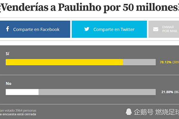 按理说,保利尼奥在巴萨有一个出色的处子赛季,球迷们应该不想让他走才对。但据《世界体育报》的民调结果,竟然有78.12%的巴萨球迷认为应该5000万将保利尼奥卖掉。球迷们主要还是嫌保利尼奥年龄偏大,巴西人并不是巴萨不可或缺的球员,而且巴萨也应该为未来考虑。
