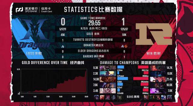 在16分钟的时候,RNG上单姿态的剑魔因为走位太深被KZ上单Khan的蒙多开大击败。而几乎是同时下路开始大混战,RNG辅助Ming的莫甘娜Q中了洛,Uzi拿到人头后蒙多TP加入战斗,RNG四人拉开战线却始终没有撤退,小虎跟MLXG更是留人跟封了KZ的后路,这时一个灵性TP姿态的剑魔复活后立马加入战场完成了0换4,后面RNG顺势拿下大龙。