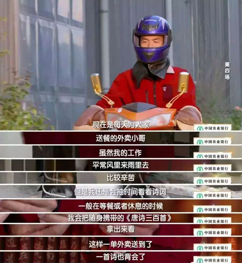 “一般在等餐或者休息的时候,我会把随身携带的《唐诗三百首》拿出来看,这样一单外卖送到了,一首诗也背会了,心里特别高兴。”