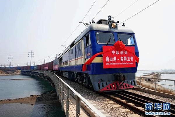 2018年4月26日,发往比利时安特卫普的国际集装箱班列从唐山港京唐港区驶出。来源:新华社