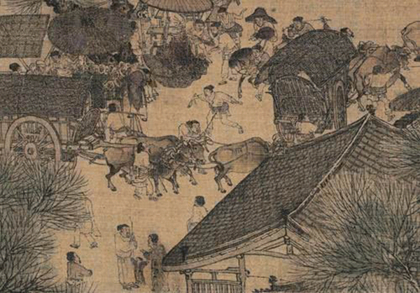 沿着河边走,在巨大的城门附近,挑担的、骑马的,还有一个人拿着小棍儿开道,热闹的街道旁,两个大人聊得不亦乐乎,旁边的小孩全身流露出不耐烦的气息:别说了,还回家不?
