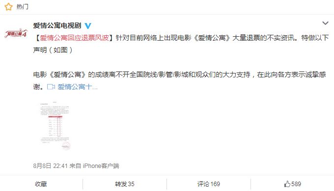 当晚,《爱情公寓》发行方联瑞影业发布声明函,表示大量退票一事是“不实资讯”,并晒出几部影片的退票数据,以说明《爱情公寓》的退票比例符合一般规律。