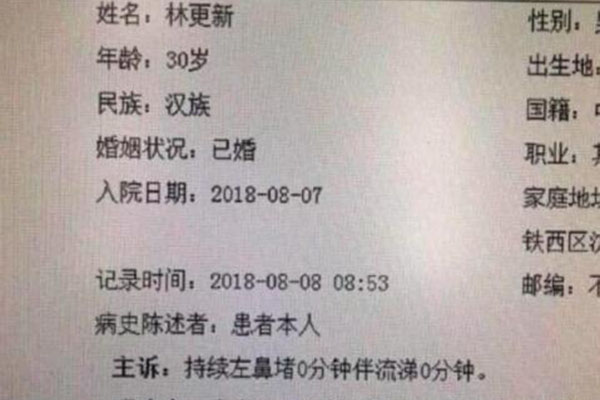 近日,有网友曝光一名叫“林更新”的患者病例,上面姓名、年龄和部分地址均与艺人林更新相符,而在婚姻状态那一栏赫然写着“已婚”二字。