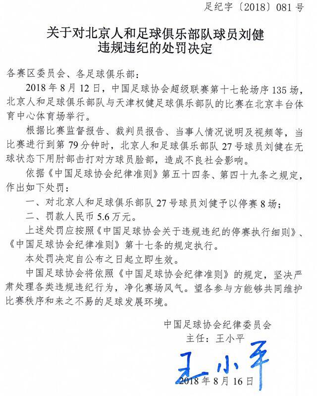 在足协罚单中描述,刘健在比赛中无球状态下,用肘部击打对方球员脸部,造成不良影响,按照相关规定,刘健被禁赛8场,罚款人民币5.6万元。尽管赛后,刘健就第一时间对自己的不冷静行为道歉,但是仍旧无法挽回停赛的处罚,他的停赛,对于人和保级来说也是一次致命打击。