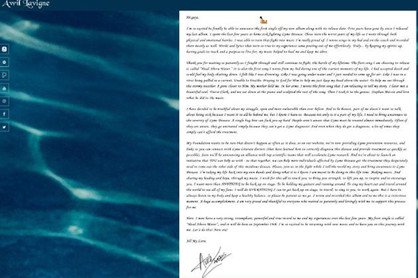 北京时间7日凌晨,艾薇儿自曝新单曲《Head Above Water》宣传图,宣布9月19日全球首播。并为歌迷写了一封长长的感谢信: