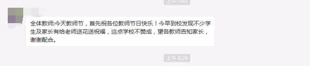 看上面这条信息,这一点,倒是很好的举措,每到教师节,学校门口卖花的,简直要乐开花了,多好的商机呀,就那么简单的一束假花,价格却不少,尤其是小学生们,屁颠屁颠地就问家长要钱去买花了,要送给老师。心意是不错,但这种举动,还是就免了吧!尊敬老师,认真学习就可以了的!