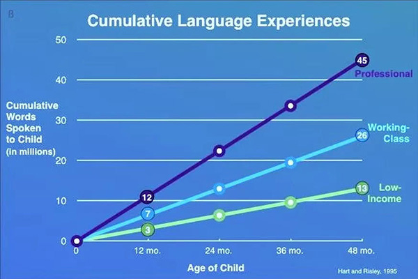 他们发现,来自富裕家庭的儿童在3岁时听到的词汇比贫困家庭的儿童多3千万个。这3千万单词数量的差距能够有效预测一个孩子在9岁时的成绩好坏。