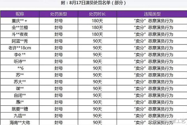 这个名单是官方8.17公布的演员处罚名单,我们可以看到演员处罚还是相当严厉的,起步就是365天。这一点我还是相当满意的。其实大家平常玩游戏输掉比赛之后,都会抨击队友是演员,其实不然真正的所谓的演员只会出现在高分段,低分段是没这个必要的。