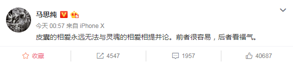 9月19日凌晨,马思纯在自己微博发文称:“皮囊的相爱永远无法与灵魂的相爱相提并论。前者很容易,后者看福气。”她分享自己对于感情的感受,引起网友热议。