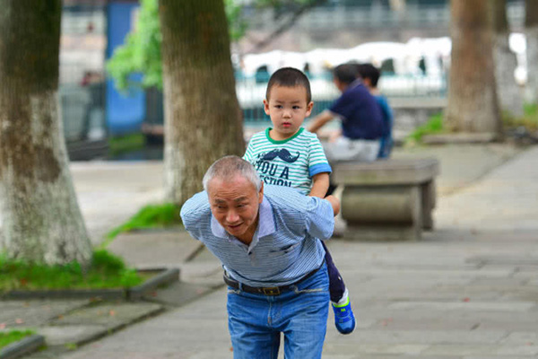 宁波月湖公园里,一位爷爷背着孙子玩耍,本就不好的腰被压的更弯了。