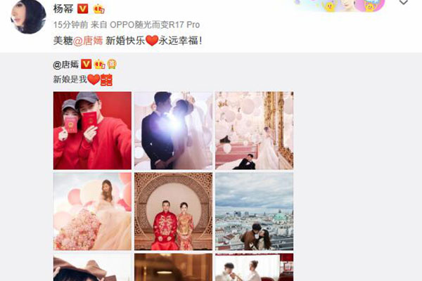 10月28日,唐嫣罗晋在微博宣布结婚喜讯,随后杨幂特意选在唐嫣生日的时间(12点06分)发文送上新婚祝福:“美糖,新婚快乐,永远幸福。”