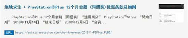 今天我们发现港服的PS商店已经出现了PS4版《绝地求生》的相关信息,显示将于11月14日开始发售12个月PS PLUS+《绝地求生》的捆绑包。