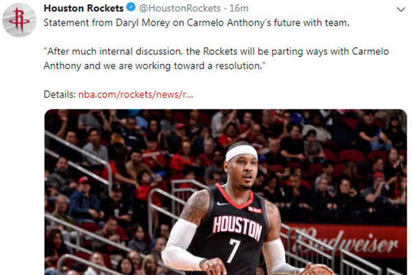 11月16日,ESPN记者沃纳洛夫斯基透露,火箭将和安东尼分道扬镳,他们并不会立刻裁掉甜瓜,会给后者留下一些寻找下家的时间。