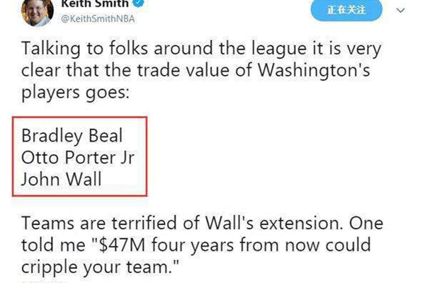 与此同时,雅虎记者Keith Smith报道奇才最有交易价值的球员依次是比尔、波特和沃尔,沃尔最后一年薪水是4700万美金,这严重影响球队操作的灵活性,言外之意就是全明星沃尔已经成为累赘,他的交易价值不如比尔,也不如波特,原因大概就是没人愿意接手沃尔的大合同。