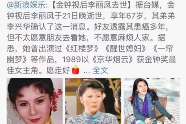 陈妍希也发文悼念,愿李丽凤老师一路走好,在李丽凤的遗作《邓丽君之我只在乎你》中她们有过合作。