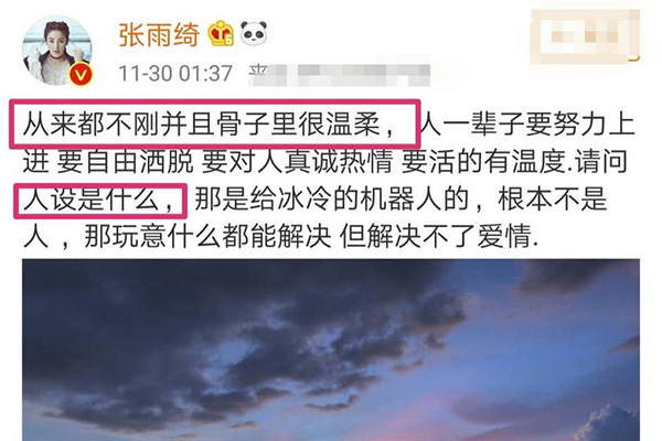 由于最近张雨绮因与袁巴元之事和直接怼某商业大佬的言论都上了热搜,所以她成了网友讨论的热点女星。可能是这些天各种舆论对张雨绮本人生活和评判有太多的不良影响,所以张女神在11月30号深夜1点37分发文回应了一些言论,第一,张雨绮否认了自己关于人设炒作之说,她直问质疑者“请问人设是什么, 那是给冰冷的机器人的,根本不是人 ,那玩意什么都能解决,但解决不了爱情”。