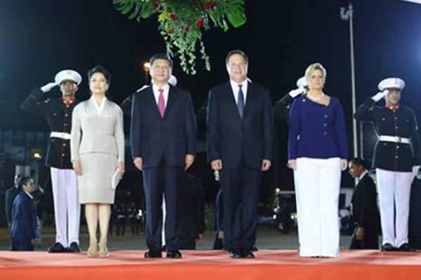 习近平和夫人彭丽媛抵达新船闸时,巴雷拉总统和夫人卡斯蒂略在停车处迎接。