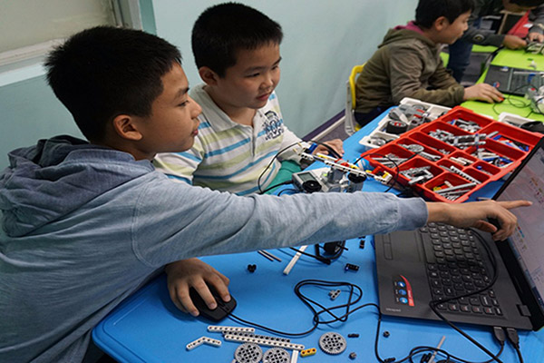 山东青岛即墨区德馨小学的学生在组装机器人。