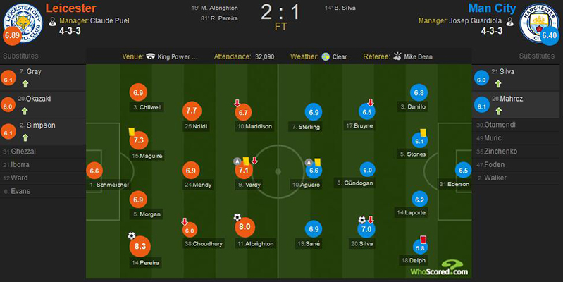 莱斯特城(433):1-小舒梅切尔;3-奇尔韦尔、15-马奎尔、5-摩根、14-佩雷拉;25-恩迪迪、24-门迪、38-乔杜里(63′,7-格雷);10-麦迪逊(78′,2-辛普森)、9-瓦尔迪(88′,20-冈崎慎司)、11-奥尔布赖顿;