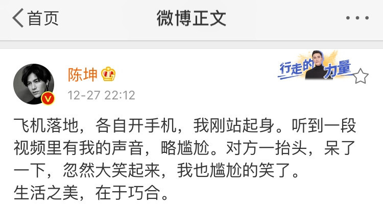 12月27日晚,陈坤[微博]通过微博回应被叫错名字,写道:“飞机落地,各自开手机,我刚站起身。听到一段视频里有我的声音,略尴尬。对方一抬头,呆了一下,忽然大笑起来,我也尴尬的笑了。生活之美,在于巧合。”