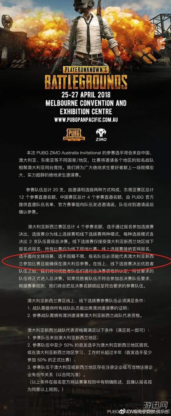 原来,PUBG ZIMO澳洲邀请赛虽然面向全球招募选手,但出线队伍须代表澳大利亚或新西兰参加比赛并且能确保在澳大利亚参赛,也就是说,中国职业选手若是被澳洲邀请赛选中的话,你就不能代表中国参赛了。最可恨的是,这个规定是在CWG打进决赛之后,才被赛事组委会的官方邮件告知的。