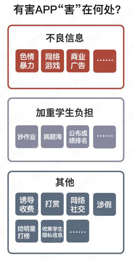 近日,教育部印发《关于严禁有害APP进入中小学校园的通知》,要求开展全面排查,建立学习类APP进校园备案审查制度,坚决防止有害APP进入中小学校园。教育部明确指出,有害APP是指那些包含色情暴力、网络游戏、商业广告等内容及链接,或利用抄作业、搞题海、公布成绩排名等应试教育手段增加学生课业负担的APP。