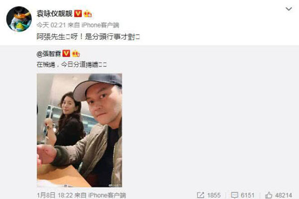 1月8日,春秋君发现张智霖在社交平台晒出一组和老婆袁咏仪的合影,但是配文却是“在机场,今日分道扬镳”把网友吓一跳,不少网友以为两人感情出问题,是在暗暗宣布离婚消息。