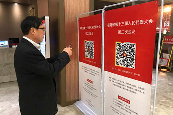 1月13日,河南省十三届人大二次会议开幕前夕,在代表驻地河南饭店,省人大代表董振杰用手机扫码下载“河南智慧人大”客户端后,轻松点击进入新开设的“代表履职服务平台”。他高兴地说:“比往年更进步了,这次会议可以用手机随时随地查看代表履职动态,我上传议案提议更方便了。”