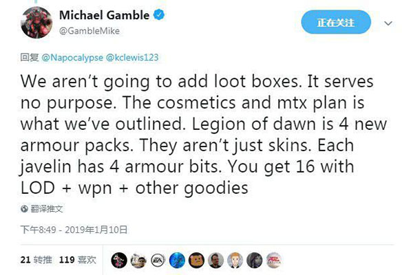 《圣歌》的首席制作人Michael Gamble近日在Twitter上再次强调,《圣歌》中不会加入开箱子的系统,它没有任何意义。