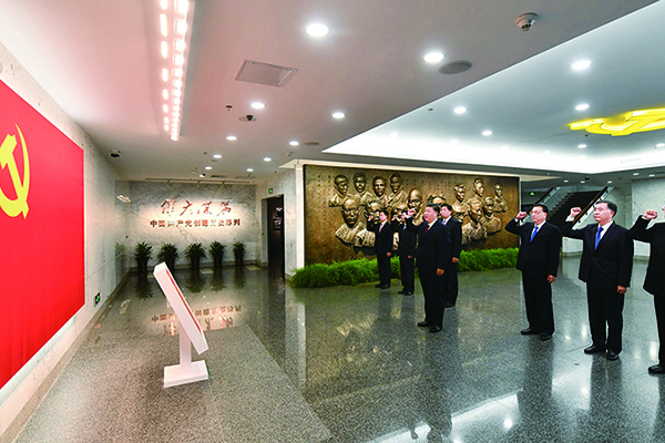 2017年10月31日,中共中央总书记、国家主席、中央军委主席习近平带领中共中央政治局常委李克强、栗战书、汪洋、王沪宁、赵乐际、韩正,瞻仰上海中共一大会址和浙江嘉兴南湖红船。这是31日上午,在上海中共一大会址纪念馆,习近平带领其他中共中央政治局常委同志一起重温入党誓词。