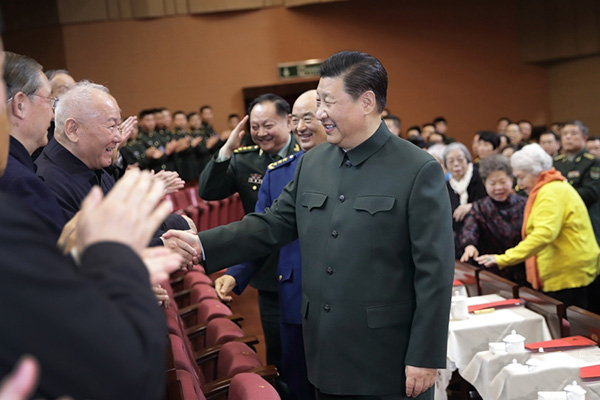 下午3时30分许,习近平来到老同志中间,全场响起热烈掌声。习近平同大家亲切握手,关切询问他们的身体和生活情况,共同回顾在党的十九大精神指引下,过去一年来党、国家和军队事业展现的新气象、开创的新局面、取得的新成就。老同志们一致表示要更加紧密地团结在以习近平同志为核心的党中央周围,坚持以习近平新时代中国特色社会主义思想为指导,深入贯彻习近平强军思想,深入贯彻新时代军事战略方针,锐意进取,埋头苦干,以优异成绩迎接新中国成立70周年。