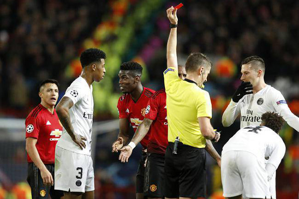 双方开场后谨慎开局。维拉蒂传球,前曼联边锋迪马利亚外围射门偏出。曼联频频试图在右路撕开巴黎防线,阿什利-扬传球,拉什福德传中偏转后被布冯扑出近角。金彭贝和德拉克斯勒的犯规均被黄牌警告。博格巴外围射门高出。