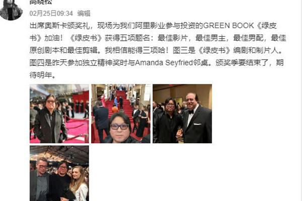 2月25日上午,高晓松在微博晒出一组出席奥斯卡颁奖礼的照片,照片中高晓松穿着黑色西装黑色衬衫,在红毯上留影。女神阿曼达还搂着他的脖子合影,高晓松一脸通红,十分可爱。