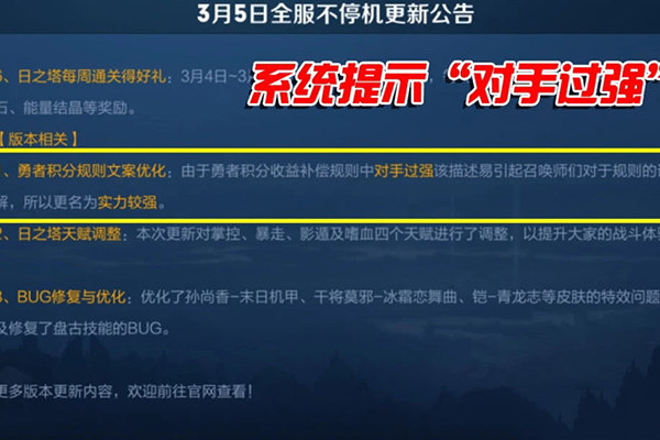近日,王者荣耀进行了一波更新,这次的更新除了为即将到来的女神节预热,也对不少系统机制进行了修改,其中有一项机制则引起玩家的热议,相信玩排位的玩家们一定遇到过,那就是排位中出现“对手过强”的提示。