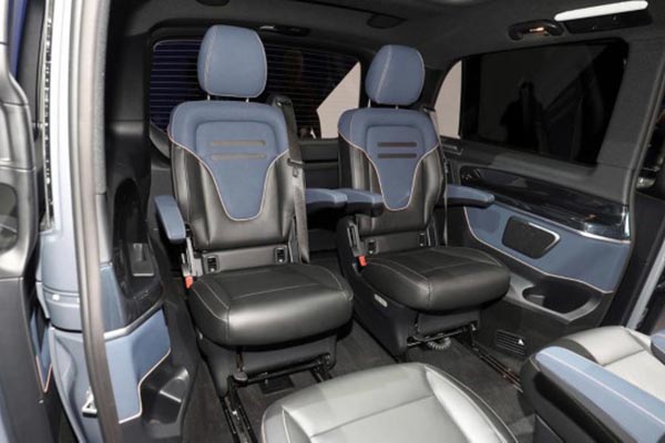 内饰上,EQV采用蓝色皮革装饰,中控台细节以玫瑰金色点缀,承袭奔驰一贯的高端风格。此外,奔驰EQV将配有最新的梅赛德斯-奔驰MBUX信息娱乐系统和连接系统,具有语音控制功能。同时,卫星导航系统还将考虑车辆电池的充电情况和充电地点,应用程序将能够对汽车进行预热,并支付充电费用