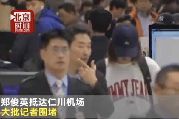 见到韩国媒体围守机场的超大阵仗,郑俊英一出关就压低帽沿,一句话也不说。