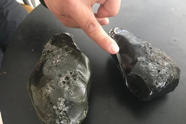 近日, 牛先生带着他两个“宝贝疙瘩”来到了郑州市农业路。当牛先生从挎包中取出自己捡到的两个“宝贝疙瘩”后,记者看到,这是两块通体墨绿色、又有点像黑色沥青,且带有许多小孔洞的“石头”。两块石头光滑面的手感如同玻璃,碎裂的边角处还能清晰地看到破碎的玻璃纹路,长度都在10厘米以上,宽度约有6厘米,入手较重,尖锐的边角也较为锋利。记者通过网络搜索对比,其外貌体征确实与网上图片中的玻璃陨石十分相似。