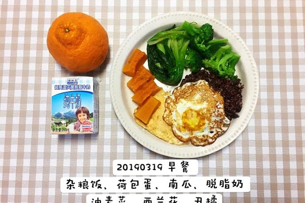 这份早餐堪称完美。少量的杂粮米饭、一份荷包蛋、蒸南瓜、脱脂牛奶、清灼油麦菜、西兰花和一个丑橘。营养搭配堪称全面,维生素、蛋白质、碳水以最合适的比例出现。而水果,其实可以留到饭后一两个小时左右来吃。而且水果以橘子、苹果、草莓这种低糖含量的水果为主,量不可以过大,以一个橘子或一个苹果的量为最佳。