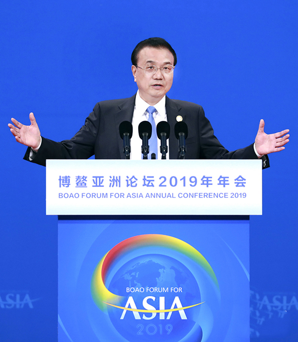 3月28日,国务院总理李克强在海南博鳌出席博鳌亚洲论坛2019年年会开幕式,并发表题为《携手应对挑战 实现共同发展》的主旨演讲。