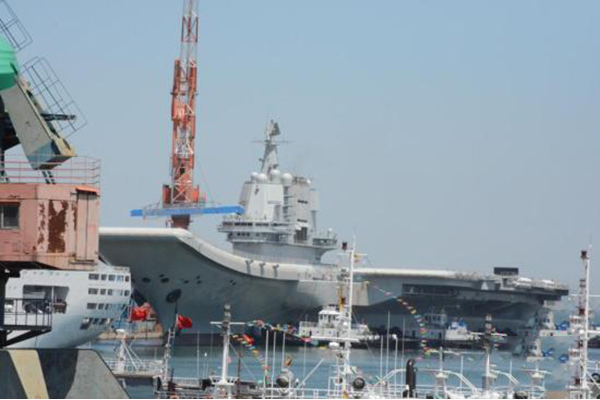 会上有记者问:在国产航母建设发展上有没有好消息告诉我们?网上有图片显示,中国万吨级驱逐舰055舰被曝挂满了彩旗,请问这是否意味着055舰将于近期入役?