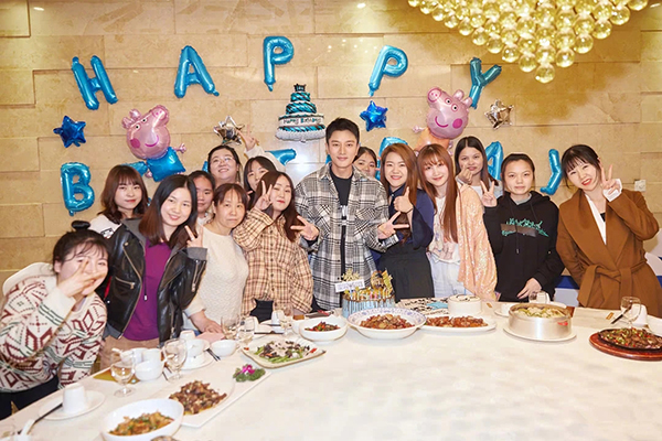 这张笑容就满分啦,而且这么近距离拍摄,看得出他真的很显年轻。粉丝送的蛋糕都非常有意思,蛋糕上面写的好像是最红两个字吧,希望他能够一直火下去。