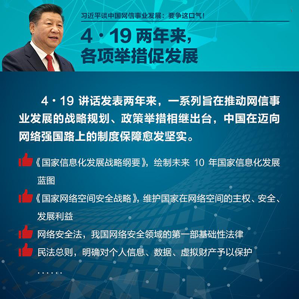 2016年4月19日,习近平总书记在网络安全和信息化工作座谈会上发表重要讲话,提出一系列新思想新观点新论断。这个重要讲话对我国网信事业发展具有深远意义。