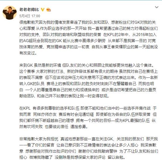不管是在AG或是GK,不要收流言蜚语的影响,正视自己,努力打好每一场比赛,和队友好好相处就好。可能再看你与梦老师Vv他们一起并肩作战的机会不多了,但希望你们的关系还能很好,私底下能开开黑什么的也很不错啊,祝友谊长存。