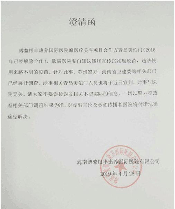 昨天上午,网上流出了盖有海南博鳌银丰康养国际医院有限公司公章的澄清函,称违法宣传、使用来路不明的疫苗是原医疗美容项目合作方,青岛美伯门之家美容信息有限公司私自做出的。此外,一位当事人给记者提供了一段视频,视频显示的是在一次4月初的沟通会上,博鳌银丰康养国际医院一位医生大发脾气,认为医院并没有责任:“咱们还是受害者呢,好好的医院让它鼓捣成啥了?天天这个来检查,那个来检查,有我们的事儿吗?我们只是说和你合作医疗美容的,结果你弄出来这些破烂事儿跑我们这儿来了?”